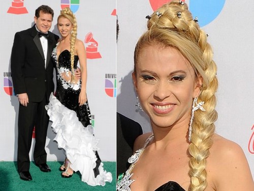 Ao lado de Chimbinha, Joelma, da banda Calypso, surgiu com um modelito bordado e com babados no tapete vermelho do Grammy Latino. A cantora não economizou na maquiagem e apostou num penteado extravagante, no melhor estilo Rapunzel.